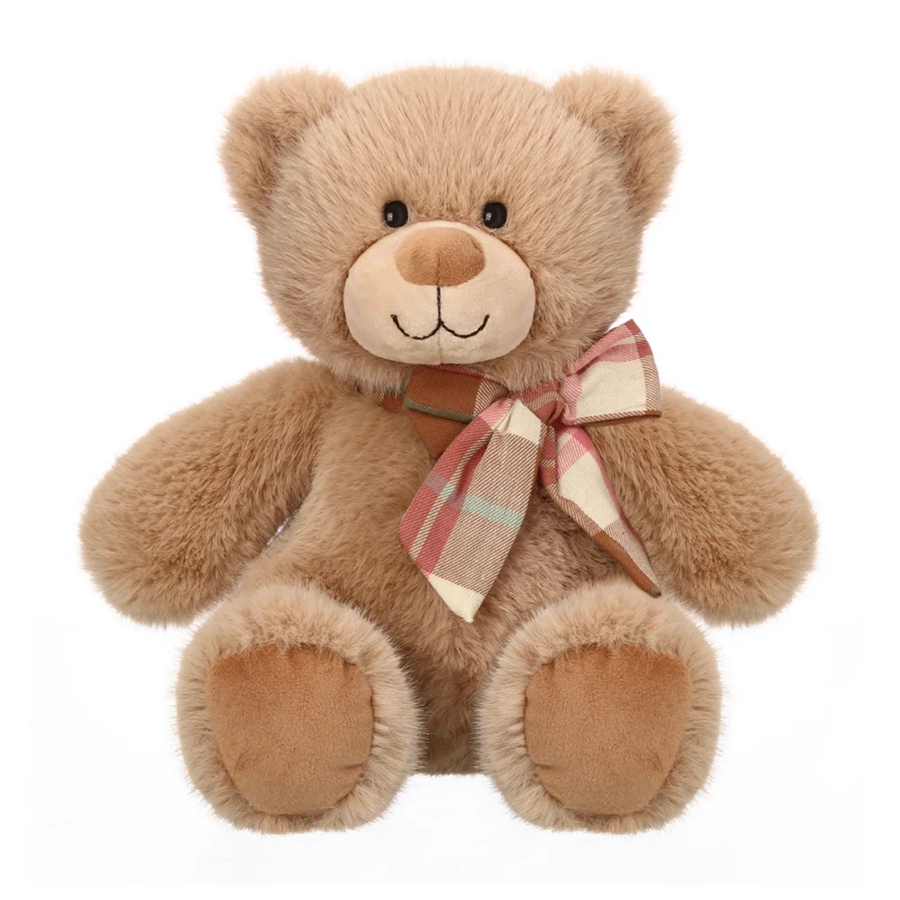 Очаровательные фирменные мишки ТМ Релана из высококачественного пушистого меха с бантиками из натурального текстиля в клетку, представлены в размере 30 см.