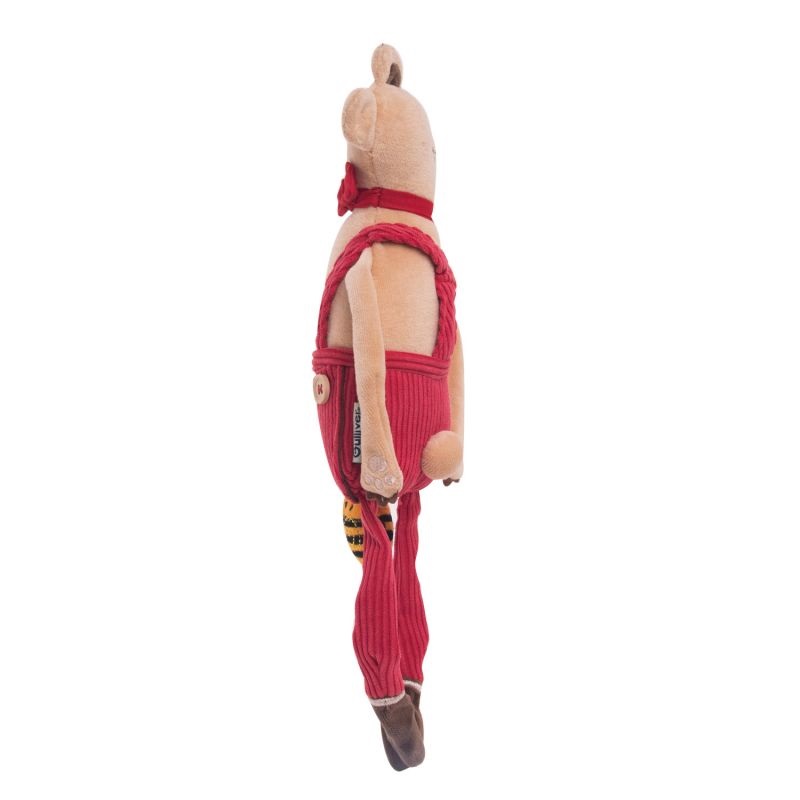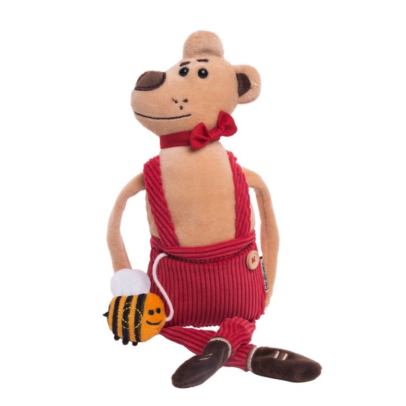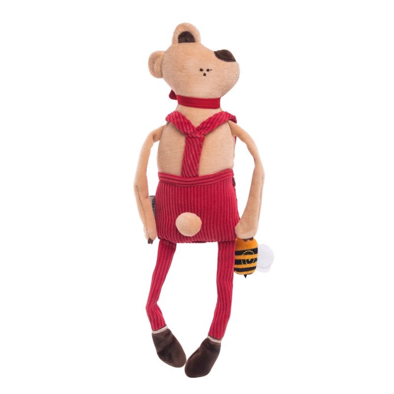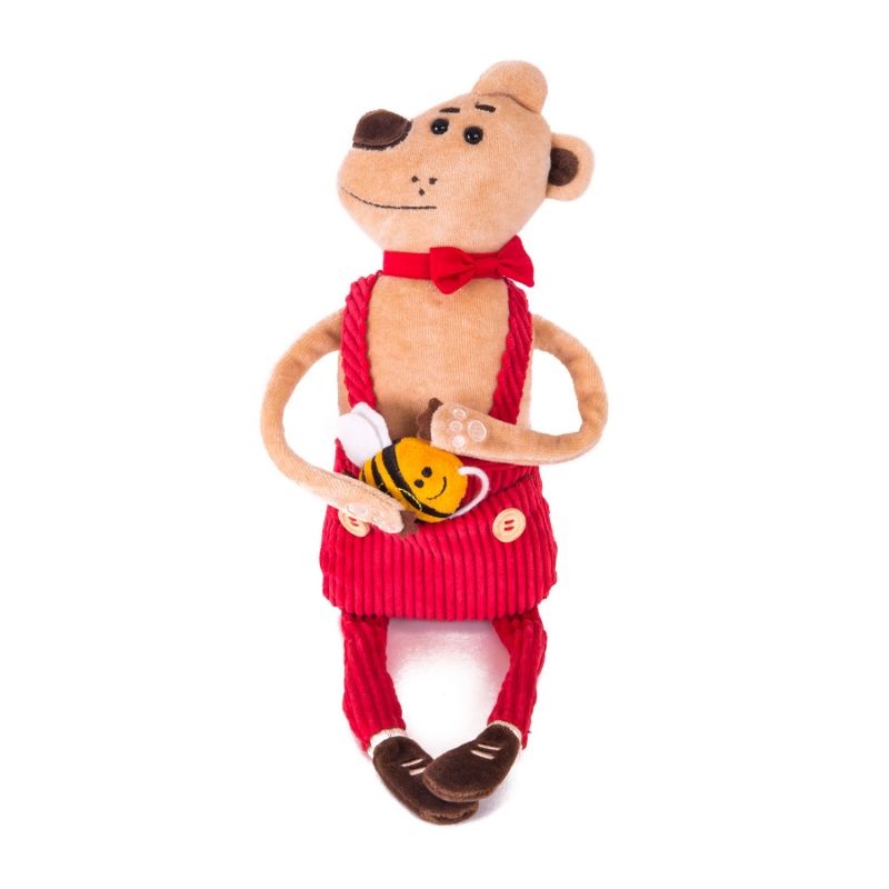 - Плюшевый зверек выполнен очень мило: у него очаровательная мордочка с черными глазками и торчащими ушками, красный комбинезон на лямках и бабочка на шее, а в лапках он держит пчелку.