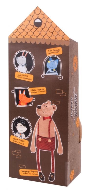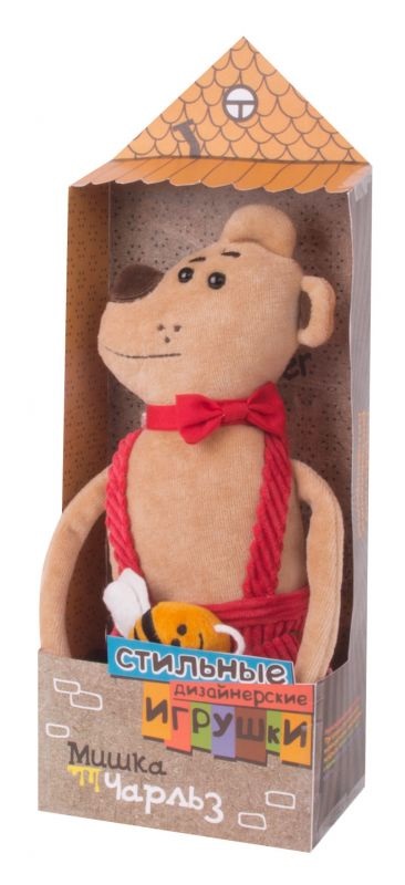 Этот медведь как будто собрался на званый ужин, поэтому надел яркий красный костюмчик и повязал на шее бабочку. Дети легко придумают и другие весёлые сюжетные игры с участием забавной мягкой игрушки с гипоаллергенным наполнителем внутри и необычной упаковкой в виде домика.