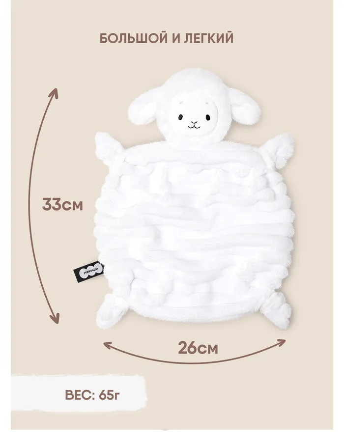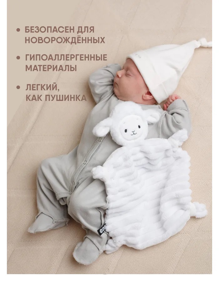 Игрушка для сна новорожденных Овечка Белла — это первая и самая важная игрушка для малыша. Созданная для самых сладких и крепких снов младенца, ванильная овечка выполнена из мягчайшего материала, который не раздражает нежную кожу новорожденного. Взаимодействуя с мягким материалом комфортера, ребенок осваивает важнейшие навыки самоуспокоения и учится засыпать самостоятельно. Теперь не придется считать овец для засыпания – нужна всего одна! Милая мордочка вызовет интерес у детей. Мама может придумать сказку или просто рассказать ребенку, как разговаривает овца, где у нее ушки, лапки, глазки, носик, ротик. А во время бодрствования комфортер отлично подойдет для активных игр – его приятная фактура ткани и вышивки поможет в развитии тактильного интеллекта и мелкой моторики. С одной стороны у комфортера фактурный мех, а с другой - гладкий, что развивает тактильное восприятие. Использовать плюшевую зверушку для новорожденных легко — ее следует носить ближе к телу и прикладывать во время кормления и укачивания. Также можно класть в кроватку, коляску или автокресло. Мягкая ткань впитает родной запах мамы, и младенец всегда будет ощущать ее присутствие. Знакомая и любимая с первых дней жизни игрушка позволит малышу успокоиться в незнакомых ситуациях — на приеме у врача, в гостях или в магазине. Внимательный подход к первой игрушке сделает ее самой значимой для ребенка на несколько первых и самых важных лет жизни и обеспечит комфортный сон маме и малышу. Стильный дизайн в актуальных пастельных нейтральных тонах придется по душе современным и динамичным мамам. Нежная и функциональная игрушка-антистресс выполнена из гипоаллергенных премиальных материалов, которые безопасны для новорожденных. Бэлла легко стирается при 30 градусах и сохраняет цвет и форму даже после многократных стирок. Очень важно, что по мере взросления ребенка, сплюшка сможет стать просто любимой игрушкой-талисманом. Будет замечательным подарком на любой праздник и как сюрприз в обычный день.