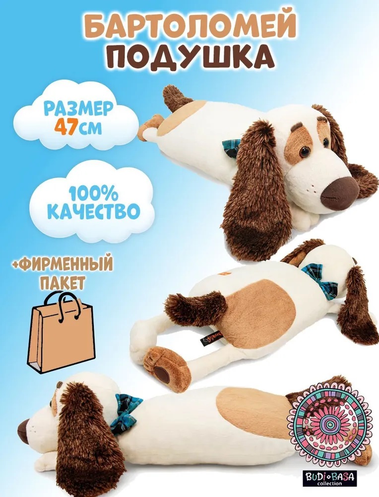 Игрушка - подушка собачка Бартоломей от бренда Budi Basa. Пёсик Бартоломей лучший друг кота Басика. Длина туловища Бартоломея без учета длины задних лап - 40 см, длина туловища + задние лапы - 47 см. Данная модель идет без подарочной коробки, которая не предусмотрена производителем из-за нестандартных размеров игрушки, но мы кладем в комплект яркий подарочный пакет! Бартоломей изготовлен из гипоаллергенных материалов. Он станет отличным подарком как для малыша, так и для взрослого. Подушка отлично впишется в интерьер детской комнаты, дома или машины. Играйте на Здоровье! Милый пес Бартоломей никого не оставит равнодушным!