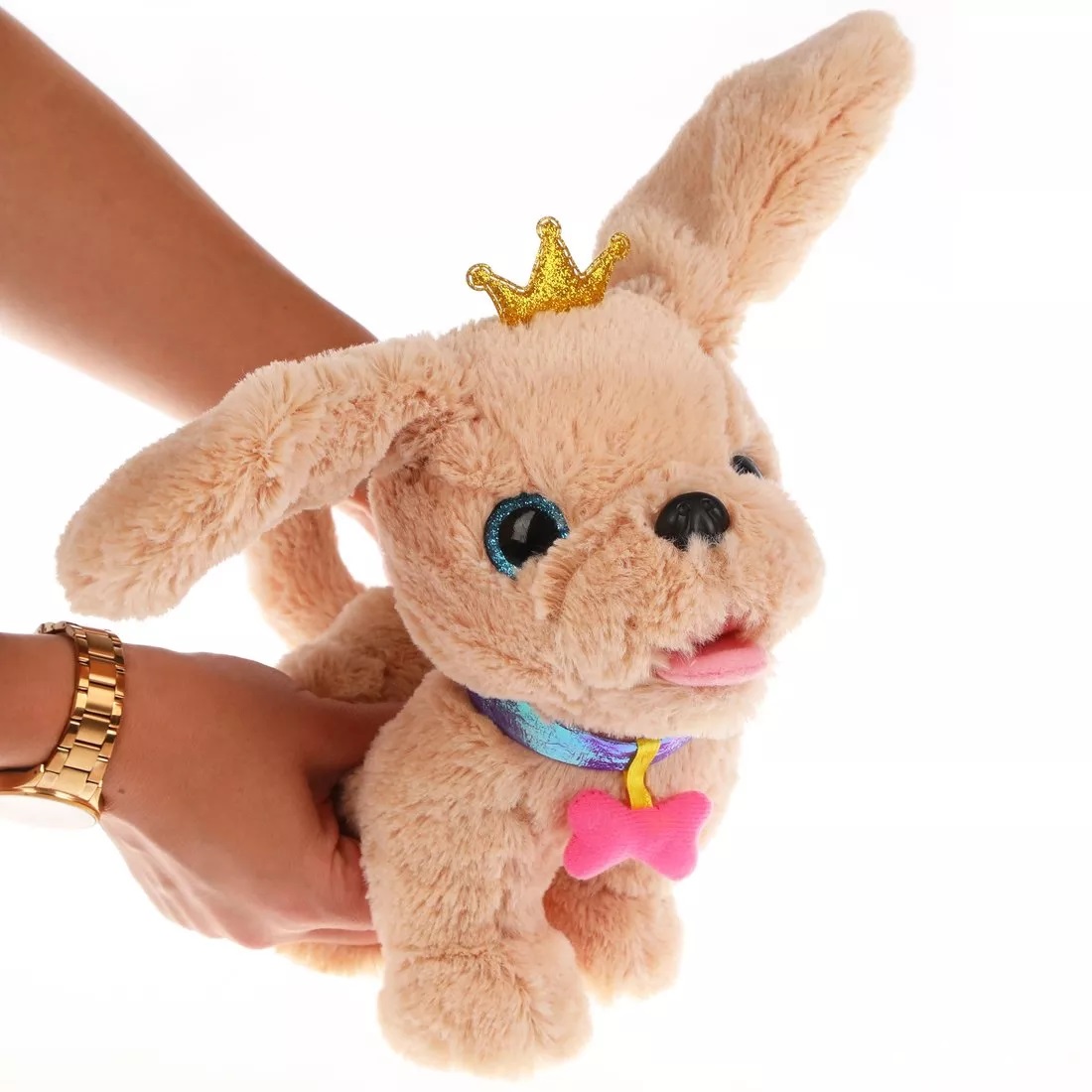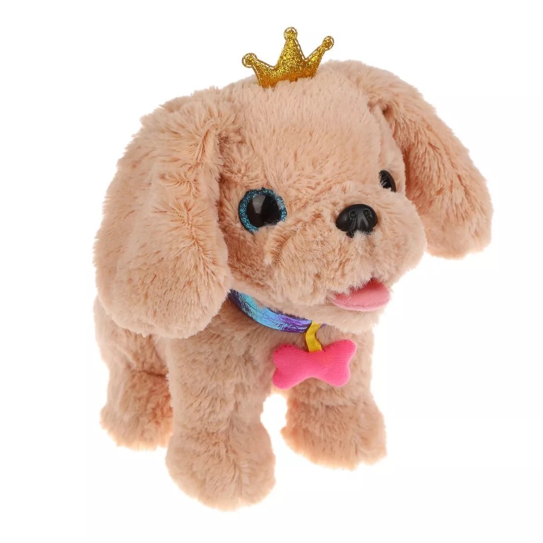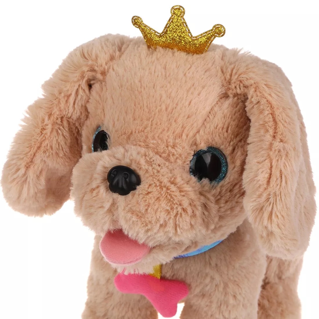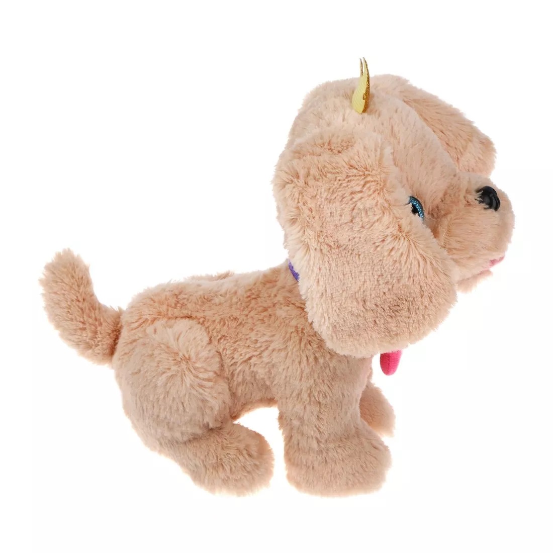 Пёсик обладает мягкой шёрсткой бежевого цвета, блестящими голубыми глазками и чёрным носиком. На шее у собачки надет оригинальный ошейник цвета фиолетовый металлик с подвеской в виде розовой косточки.