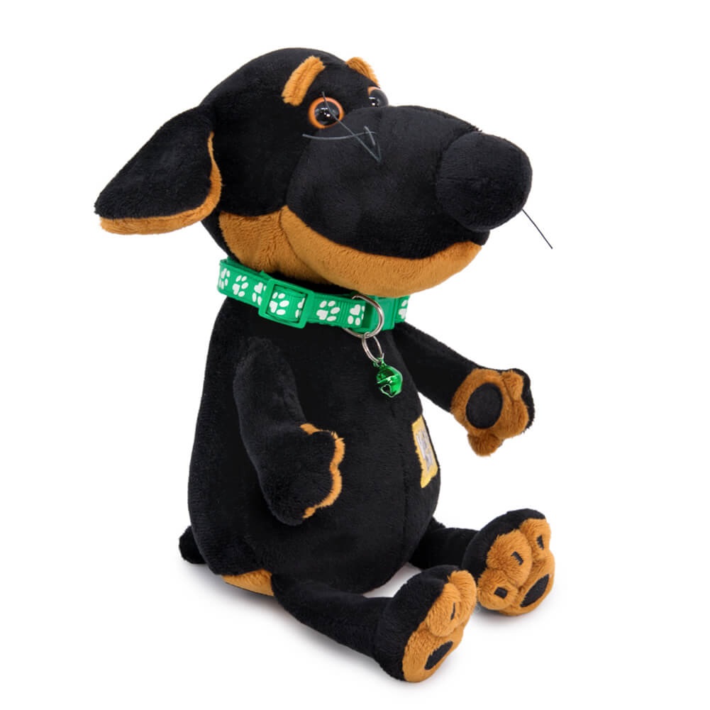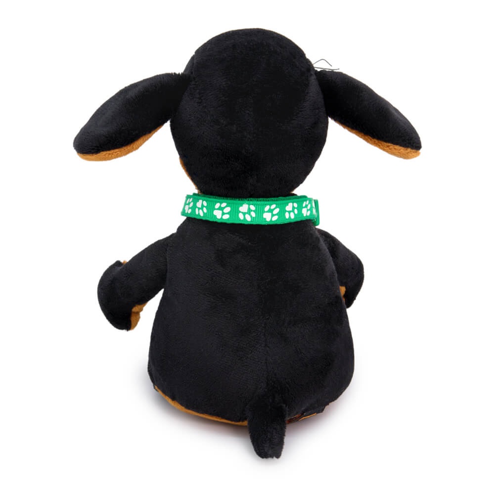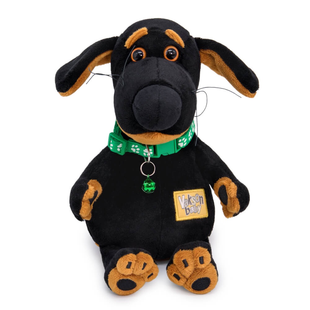Малыш Ваксон в забавном ошейнике из зеленой репсовой ленты с принтом в виде маленьких собачьих следов и с застежкой на пряжку-замок фастекс. Ошейник украшен милым аксессуаром — ярко-зеленым блестящим бубенчиком.