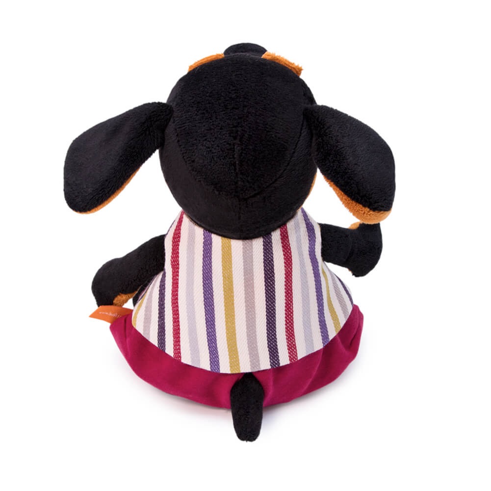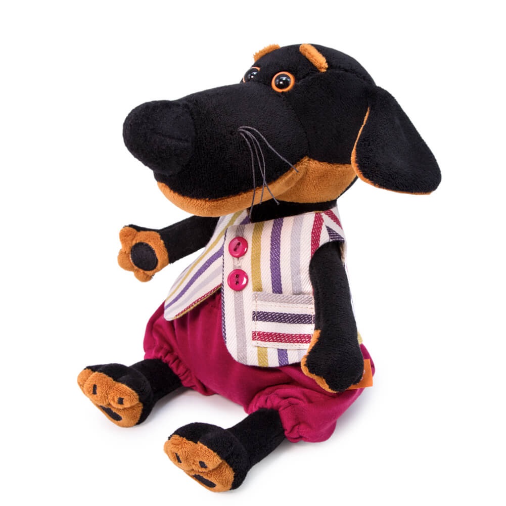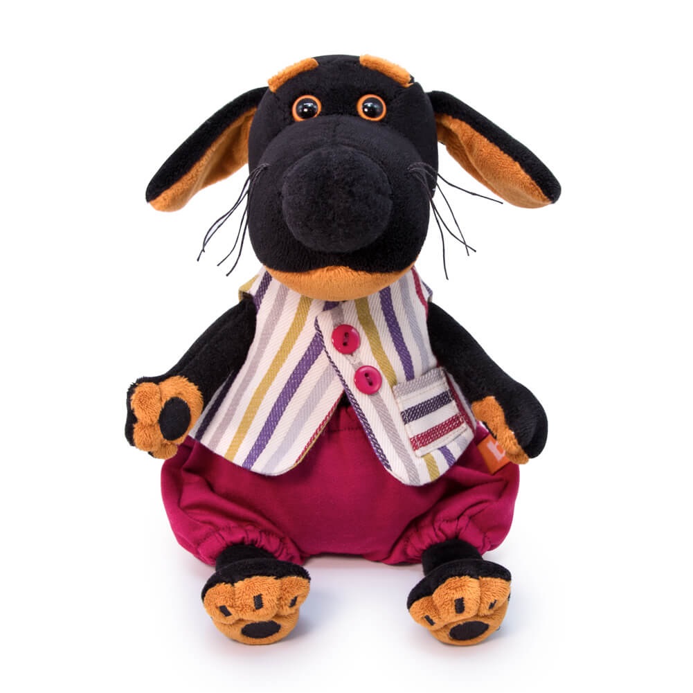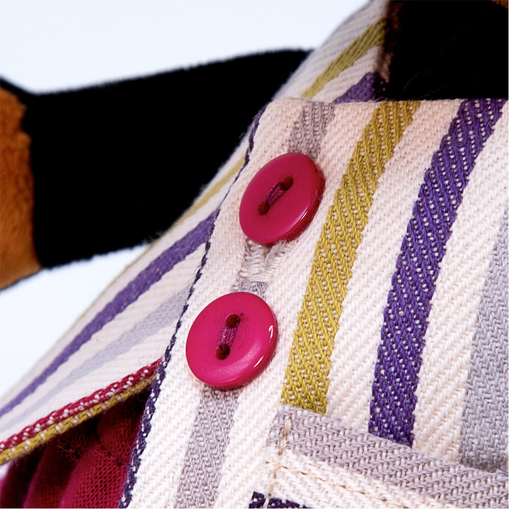 Малыш Ваксон в забавном комплекте — широких штанишках на резиночках из х/б футера ягодного цвета и жилетике в разноцветную полоску из плотного хлопка саржевого плетения.