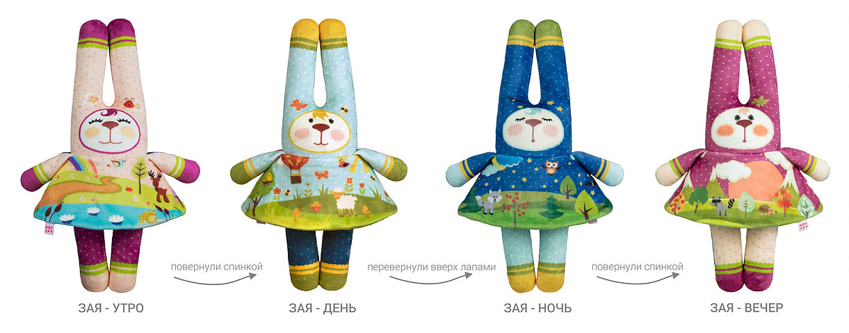 У каждой из 4 "ипостасей" зайки свой облик и нарядная юбочка с цветным принтом. Каждый принт изображает время суток - утро, день, вечер, ночь