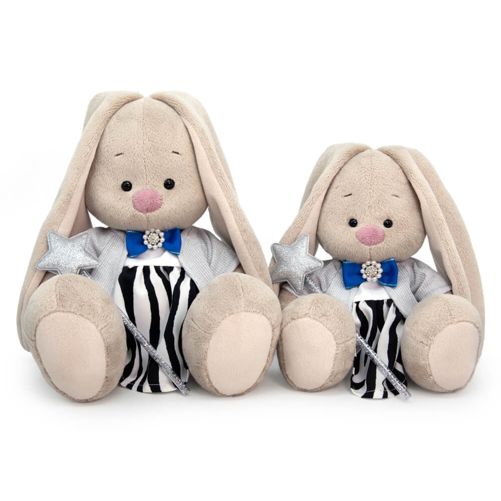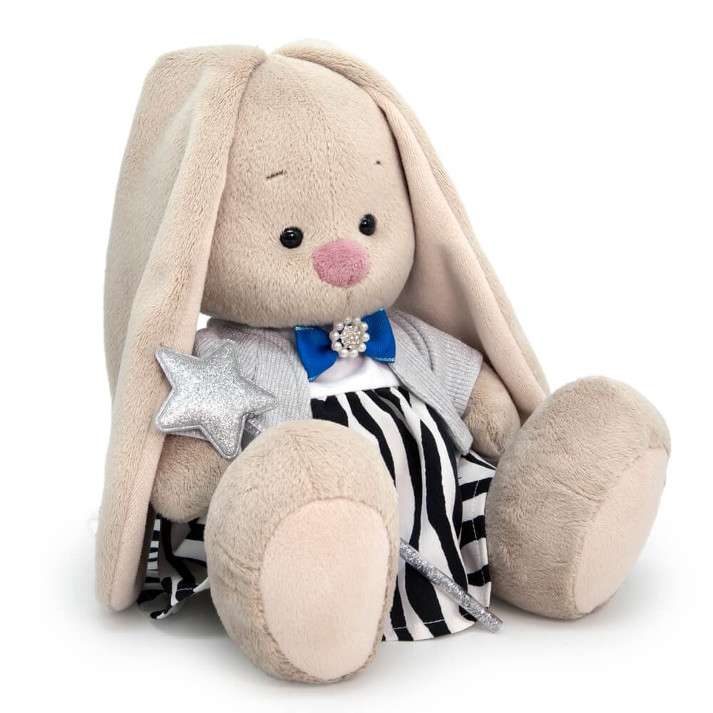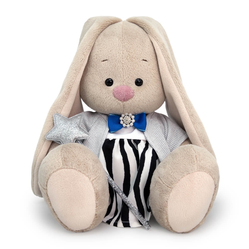 На Зайке Ми шикарный костюмчик волшебницы. Сарафанчик из двух тканей?компаньонов, белый верх и низ из черно?белой ткани с анималистическим принтом. Поверх сарафана болеро из очень модного серебристого трикотажа с люрексом. На шейке у Зайки необыкновенный бант, выполненный из синей сутажной ленты с серебристым краем. В середине банта богатая брошь, усыпанная жемчужинами и стразами. А в лапках Зайка держит необычный серебристый аксессуар — волшебную звёздочку на палочке.