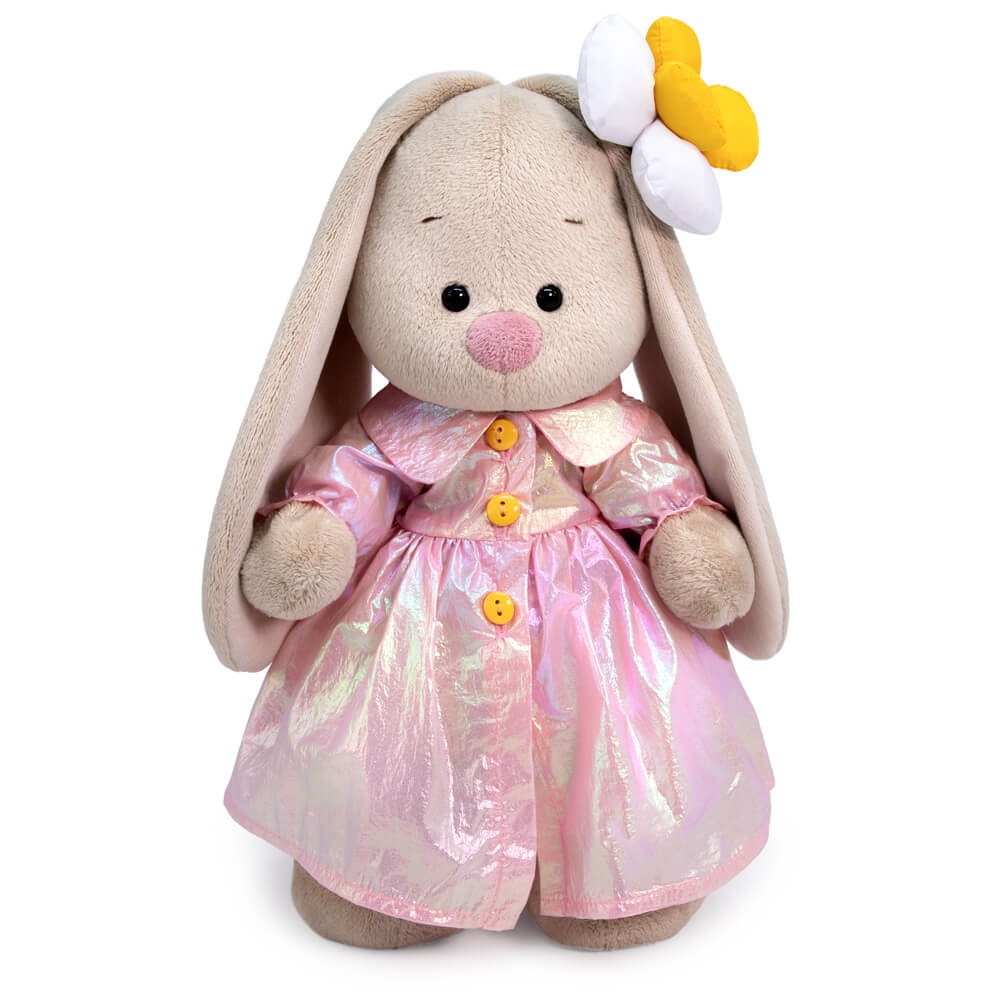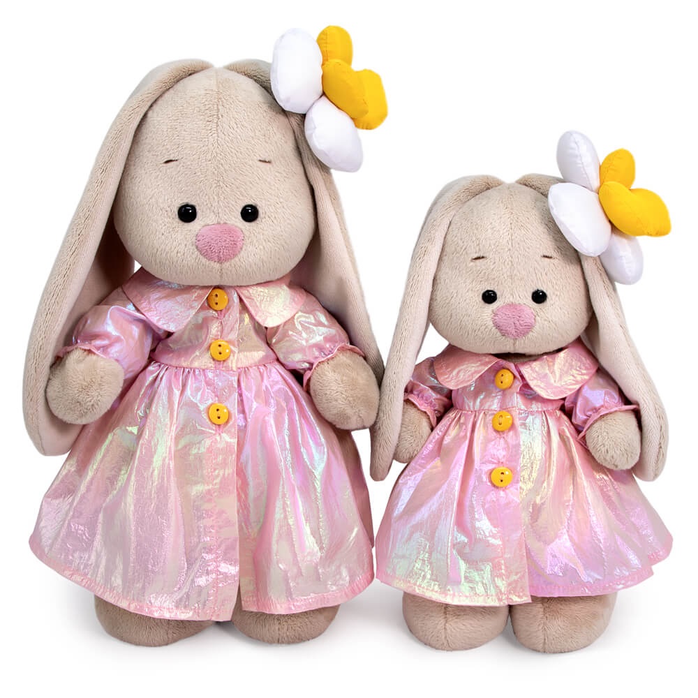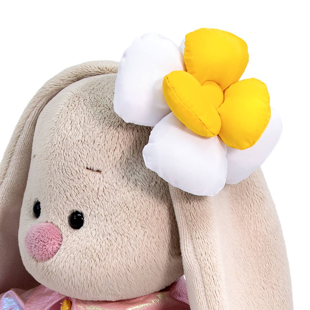 На Зайке супермодный плащик из лазерной блестящей ткани в розово?золотистых оттенках. Плащ сшит отрезным по талии, с отложным воротничком и пышными рукавчиками на резинке. На ушке у Зайки необычный аксессуар из болоньевой ткани — объемный бело?желтый цветок, мягкие лепестки которого набиты синтепоном.