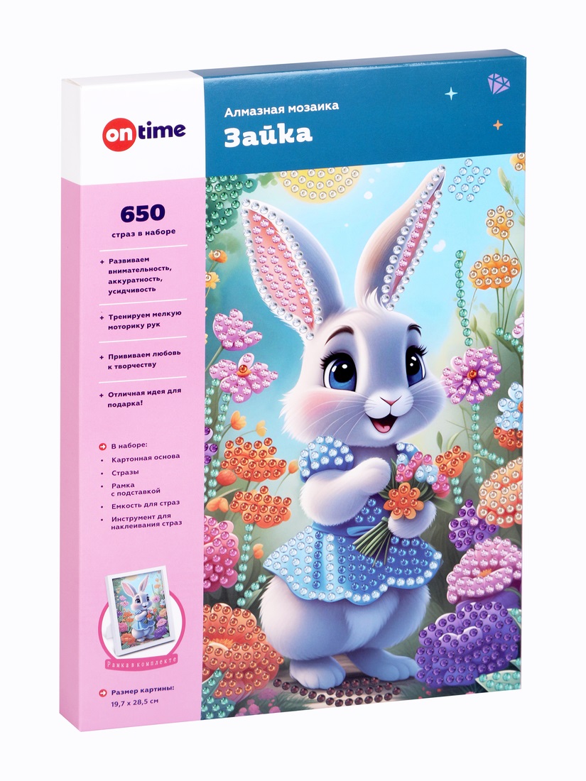 Алмазная мозаика «Зайка» включает 650 страз, картонную основу, рамку с подставкой, емкость для страз и инструмент для наклеивания страз.