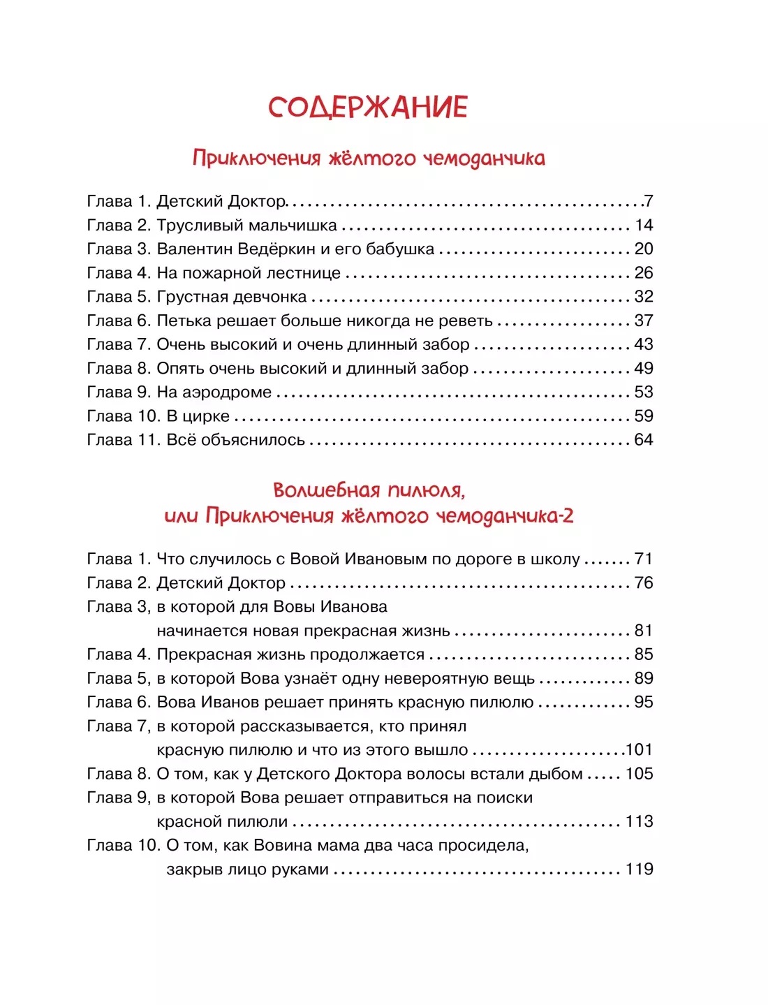 В книгу вошли две сказочные повести замечательной писательницы Софьи Прокофьевой: «Приключения жёлтого чемоданчика» и «Приключения жёлтого чемоданчика-2, или Волшебная пилюля». Они о том, как можно излечить от страха и печали, злости и коварства, глупости и вранья с помощью чудесных конфет, которые хранятся в жёлтом чемоданчике. В творческом багаже писательницы более тридцати книг, они постоянно переиздаются и получили читательское признание не только в нашей стране, но и за рубежом – они переведены более чем на двадцать языков мира.