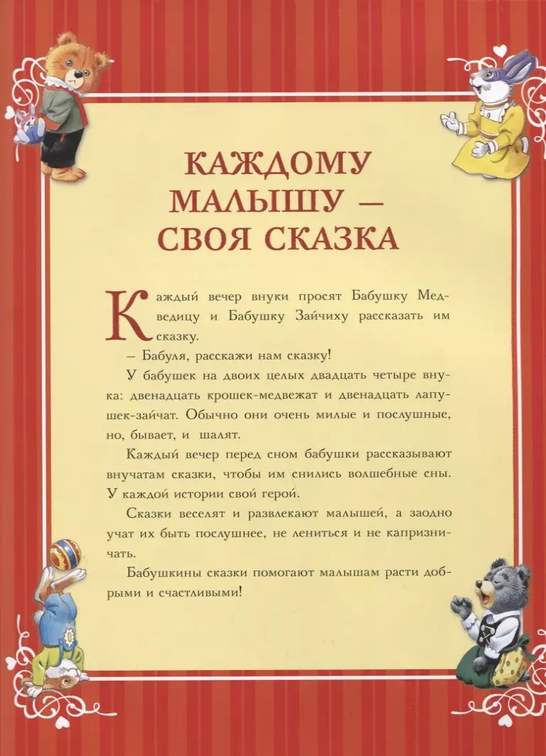 Все малыши на свете похожи. Они только познают этот мир, учатся, что можно делать, а что нельзя. Бабушкины сказки научат зайчат, медвежат, а вместе с ними и маленьких детей не капризничать, не лениться и дружить друг с другом. Рисунки к каждой истории нарисовал знаменитый итальянский художник Тони Вульф.