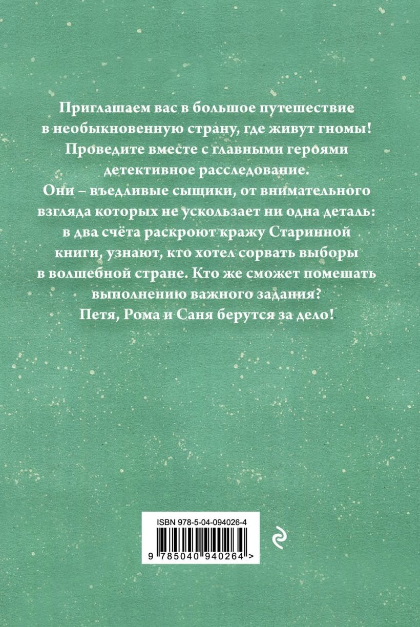 Приглашаем вас в большое путешествие в необыкновенную страну, где живут гномы! Проведите вместе с главными героями детективное расследование. Они – въедливые сыщики, от внимательного взгляда которых не ускользает ни одна деталь: в два счета раскроют кражу Старинной книги, узнают, кто хотел сорвать выборы в Волшебной стране. Кто же сможет помешать выполнению важного задания? Петя, Рома и Саня берутся за дело!