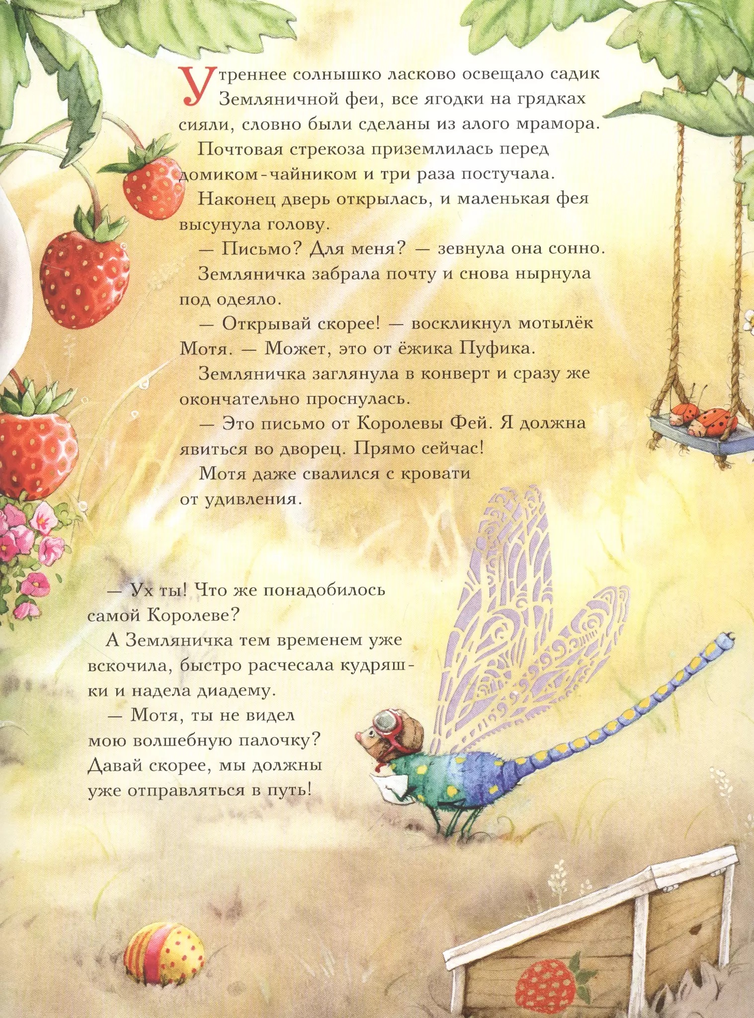 Маленькая Земляничная фея очень взволнована: сама Королева Фей пригласила её в свой замок, чтобы Земляничка помогла ей ухаживать за растениями. Фее, конечно, это не доставит проблем, ведь она настоящий мастер! Но как только Королева Фей ушла по делам, её магические растения начали делать глупости: дразнить мотылька Мотю и вызывать дождь прямо в замке. Что же скажет Королева Фей, когда увидит, какой сюрприз ей устроили дома?