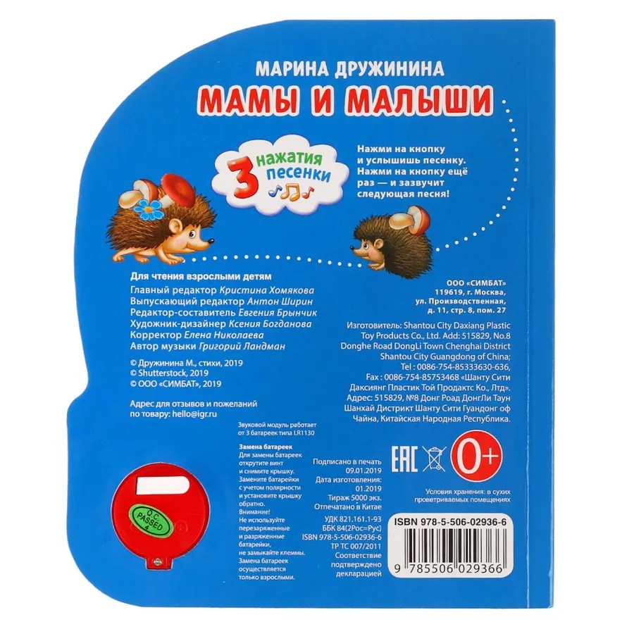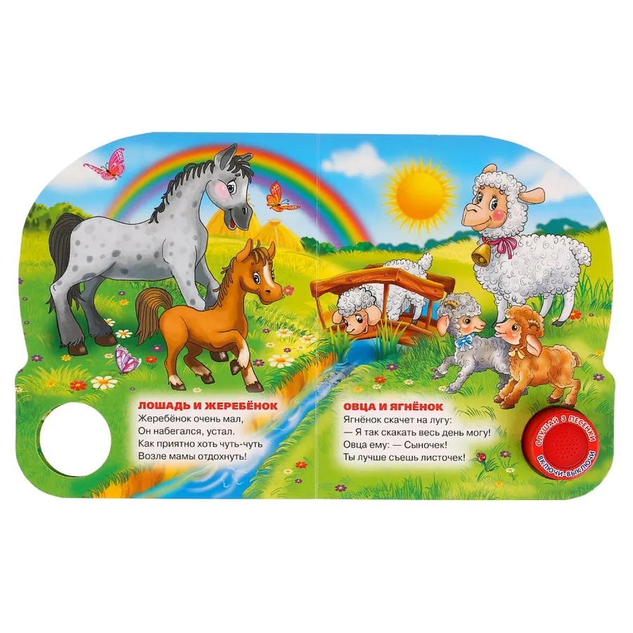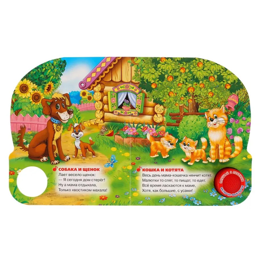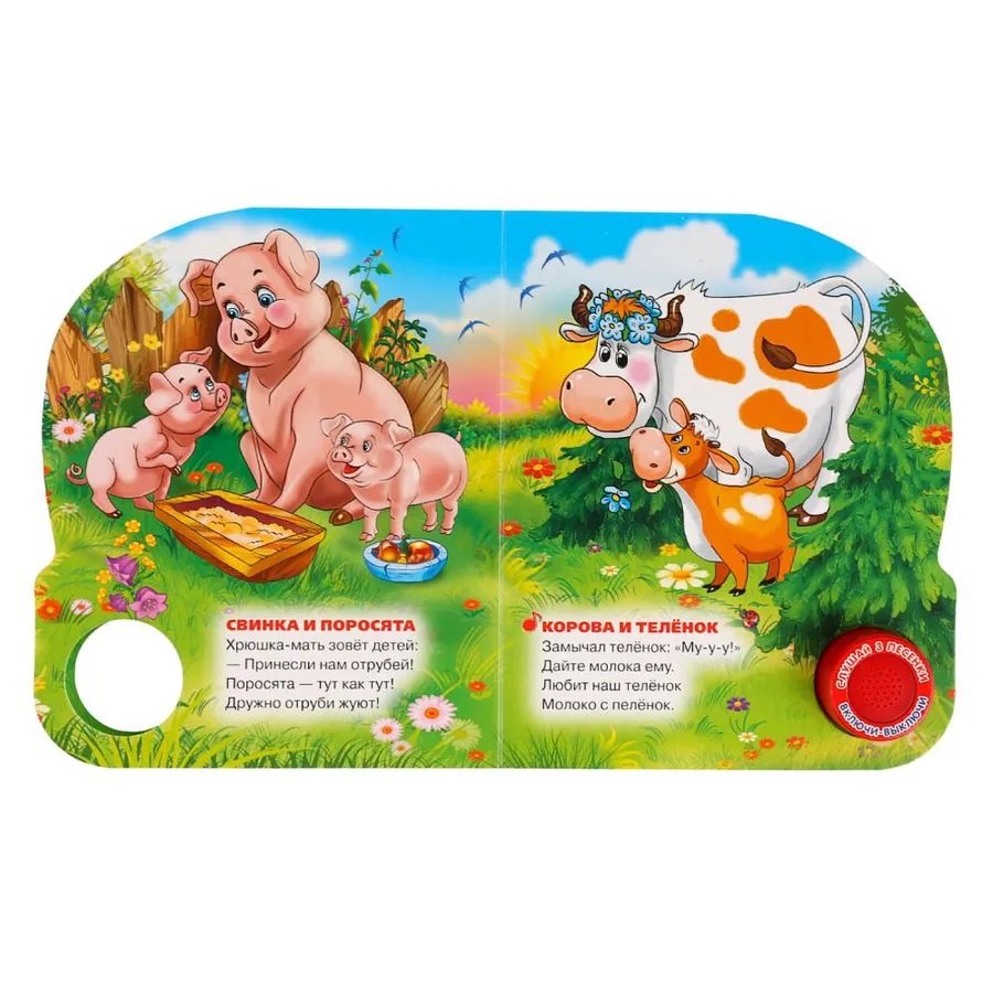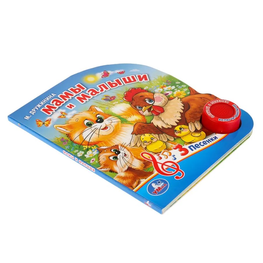 Музыкальная книжка «Мамы и малыши», М.Дружинина ТМ «УМка» станет прекрасным подарком для ребёнка: - 1 звуковая кнопка, - 3 озвученных стихотворения «Собака и щенок», «Кошка и котята», «Корова и телёнок», - стихи Марины Дружининой, - красочные иллюстрации. Ребёнок будет с удовольствием рассматривать яркие страницы и слушать стихи. Освоить включение звука легко: по нажатию на кнопку начинает проигрываться песенка, при втором нажатии звук выключится. Книжка сделана из плотного картона, поэтому можно не опасаться, что ребёнок порвёт странички.