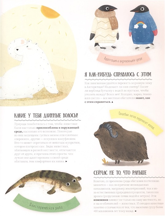 Почему у обитателей пустыни большие уши и светлая шерсть? Пингвины окружены льдом и снегом — так отчего же они не мёрзнут? Могут ли животные селиться у основания крутых гор? Конечно же, могут! Природа позаботилась о том, чтобы каждое существо адаптировалось, насколько возможно, к жизни в окружающей среде. Давай отправимся в путешествие по животному миру: в глубокие океаны, дремучие джунгли и на вершины величественных гор, — где мы встретим зверей и растения, которые действительно процветают! И ты узнаешь, как они приспосабливаются к различным условиям, делая свою жизнь более комфортной.