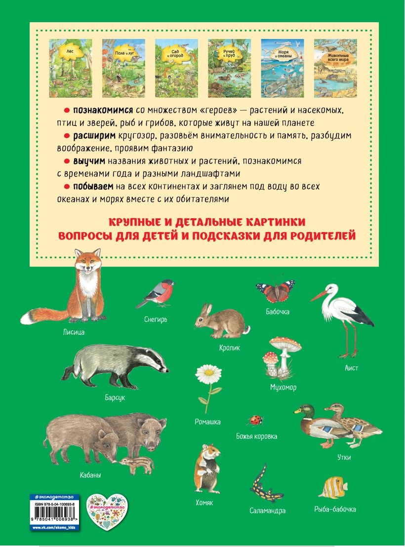 В этой книге вы встретите более 360 "героев" — растений и насекомых, птиц и зверей, рыб и грибов, которые живут на нашей планете. Являясь по сути виммельбухом, это не просто "книга-бродилка-гляделка", это еще и энциклопедия, и определитель животных и растений. Информация в книге расширяет кругозор ребенка, развивает его внимательность и память, будит воображение, позволяет познакомиться с временами года и особенностями обитателей лесов, полей, лугов, рек, побывать на всех континентах и заглянуть под воду во всех океанах и морях.Шесть тематических глав завершаются страницами с подсказками и советами для родителей, как более интересно и результативно заниматься с ребенком. Указатель в конце книги из более 360 названий позволяет быстро ориентироваться на красочных страницах.