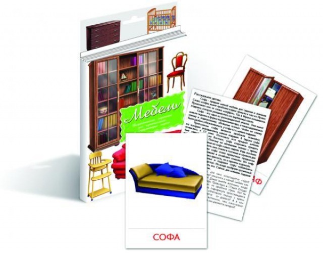 Дидактические карточки "Мебель". Это замечательное наглядное пособие с крупными яркими картинками познакомит детей с мебелью, её происхождением и интересными фактами о ней. В наборе есть изображения комода, книжного шкафа, дивана, серванта, платяного шкафа, детской кровати, кровати, обеденного стола, письменного стола, детского стульчика, венского стула, софы, полки, тумбы, журнального столика и кресла. На одной стороне каждой карточки изображён предмет мебели, а на обратной стороне дано его описание: происхождение названия, история, вопросы, которые можно задать ребёнку о прочитанном.