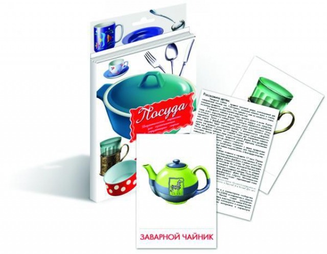 Дидактические карточки "Посуда". Его цель познакомить детей с посудой, назначением, происхождением и интересными фактами о ней. На них изображены 16 предметов: кружка, ложка, нож, вилка, блюдо, сковорода, тарелка, стакан, противень, половник, кастрюли, чашка. чайник, заварной чайник, ковшик. гусятница. На одной стороне каждой карточки изображена посуда, а на обратной стороне дано ее описание. а также вопросы, которые можно задать ребенку о прочитанном, интересные факты.