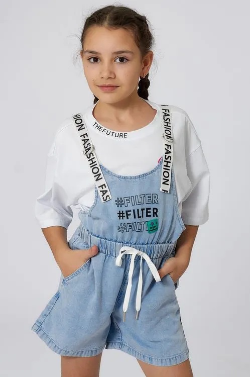 Летний полукомбинезон из ткани под джинс. Тенсел – натуральный материал, тонкий, прочный, с шелковистой структурой и долгим сроком службы. Длину лямок полукомбинезона можно регулировать. На талии изделие удерживается поясом с резинкой и шнурком, которым можно регулировать объем.